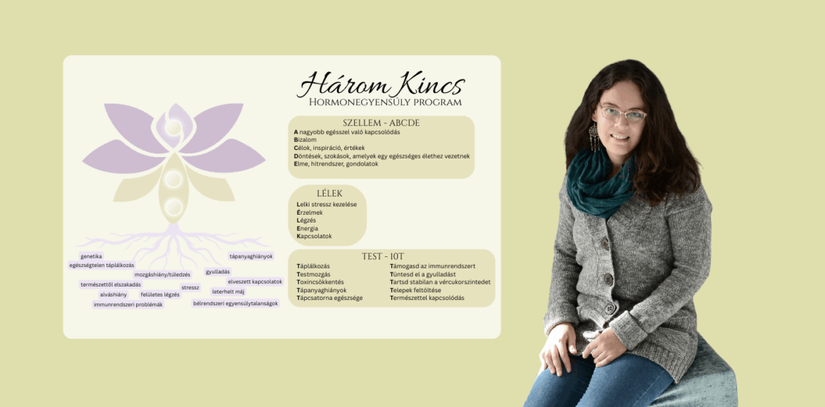 A Három Kincs Hormonegyensúly Program egy holisztikus életmódprogram, amelyben megmutatom neked, hogyan kerül harmóniába a TEST, a LÉLEK és a SZELLEM. Vagyis megtanítom: